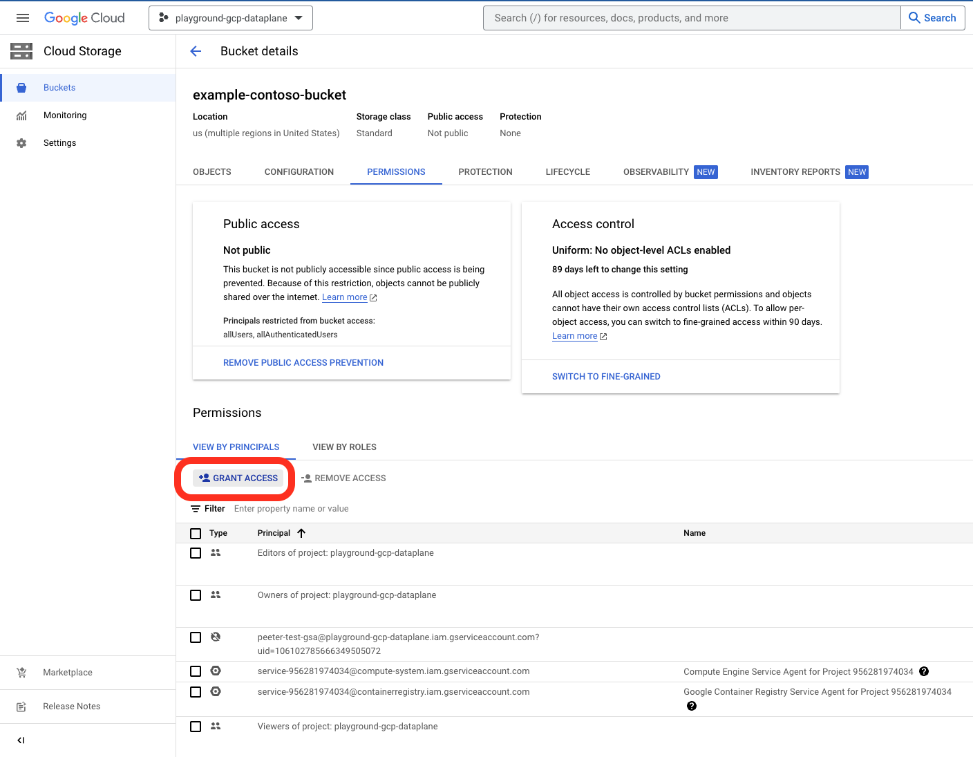 - In the Bucket details view select the Permissions tab and then select GRANT ACCESS:
